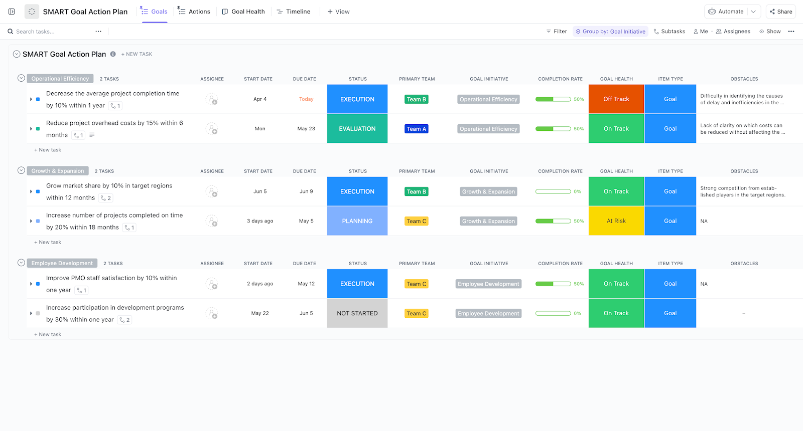 Big goals are great, but they’re just wishful thinking without structure. The SMART Goal Action Plan Template in ClickUp takes the classic SMART method (Specific, Measurable, Achievable, Relevant, Time-bound) into a practical, editable workspace.