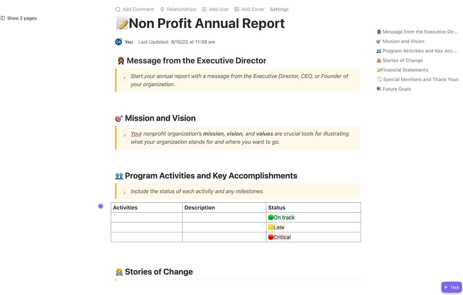 End-of-year reports don’t have to be stressful or dull. This Non-Profit Annual Report Template by ClickUp helps you pull together your impact, financials, and plans without scrambling for spreadsheets or rewriting the same info.