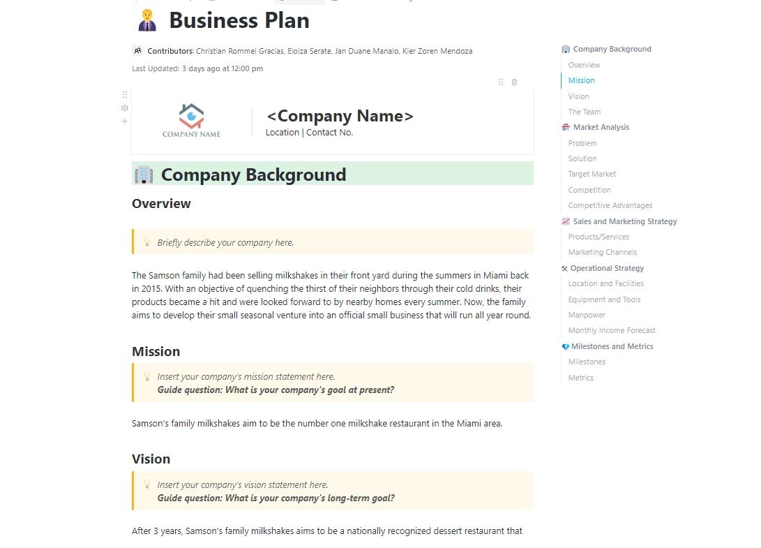 You can use the five pre-designed sections—Company Background, Market Analysis, Sales and Marketing Strategy, Operational Strategy, and Milestones and Metrics—to provide comprehensive information about your business.