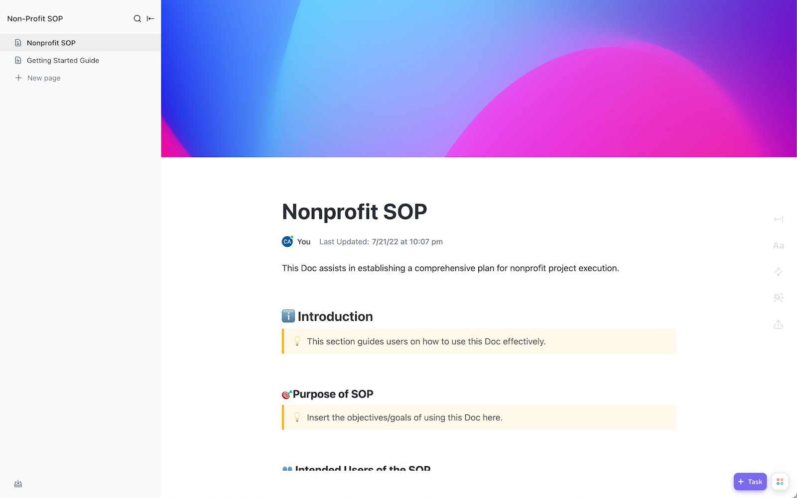 ClickUp’s Nonprofit SOP Template clarifies your daily operations by providing a framework for documenting your organization’s standard operating procedures (SOPs).