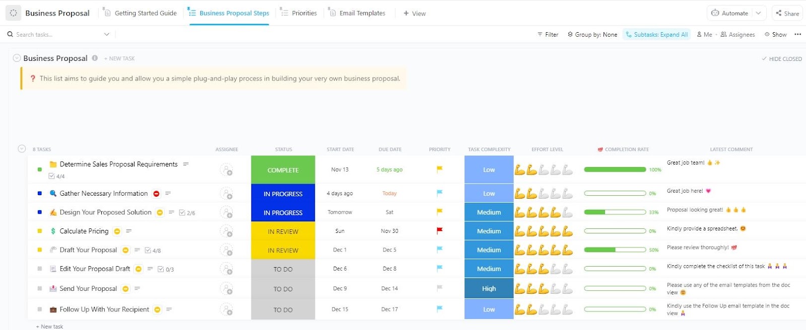 ClickUp’s Business Proposal Template provides a structured framework that guides you through each essential component of securing partnerships or project sponsors.