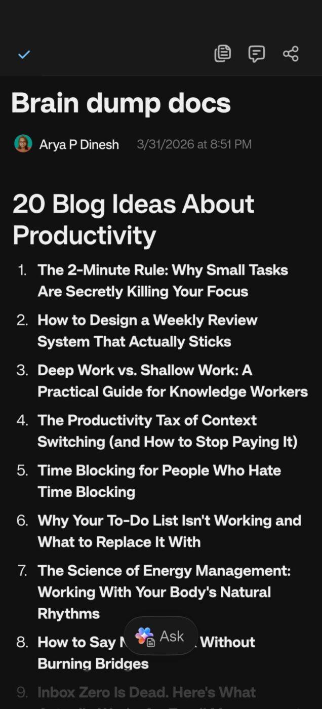 ClickUp’s Notepad is another quick note-taking feature, available on my phone and desktop. The best part is I can turn these entries into trackable Tasks as well, if I need to.