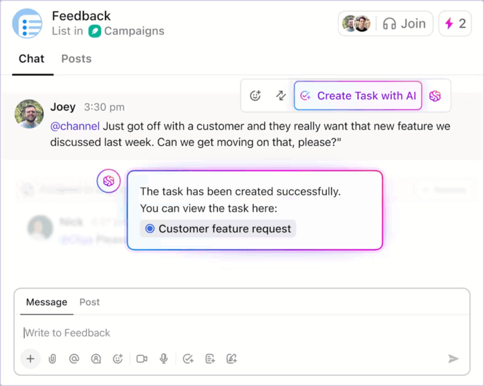 Comments, @mentions, and Chat in ClickUp are anchored to tasks, Docs, and projects. When a question is asked, it’s asked in context. When a decision is made, it’s attached to the work it affects.