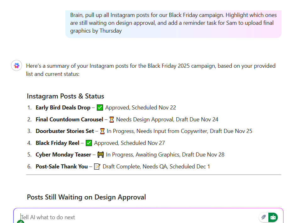 A practical flow is to keep all campaign context in a List or Doc, then ask ClickUp Brain to “turn this into a one-month content calendar with captions for LinkedIn and Instagram” or “write three hooks for this launch thread.”