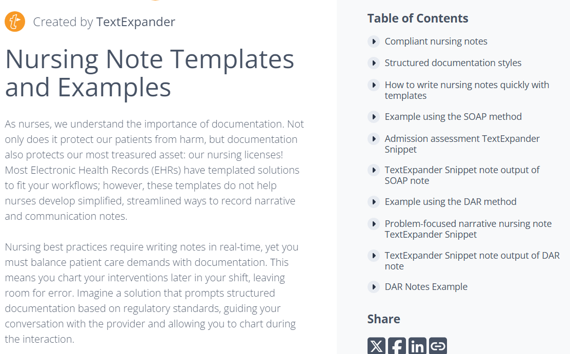 Rather than relying on manual input or generic EHR templates, the Nursing Notes Templates by TextExpander lets nurses create personalized, time-saving snippets that auto-populate structured documentation formats like SOAP or DAR notes.