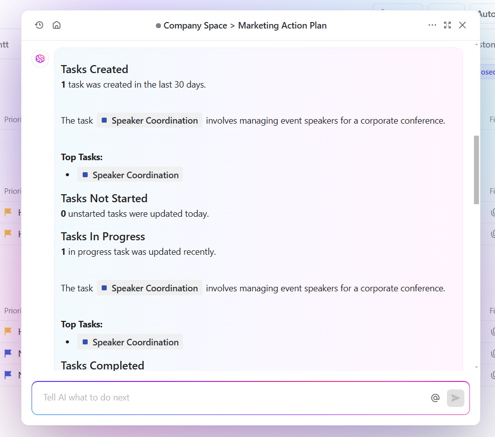 Suppose a product development team is managing a software release. ClickUp Brain scans tasks, comments, and documents to generate a structured update highlighting completed features, pending approvals, and upcoming deadlines. Stakeholders get a clear snapshot of progress without waiting for a meeting.
