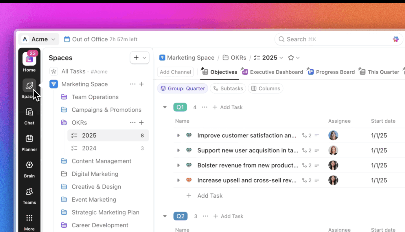 This structure grows from a handful of tasks to enterprise-level portfolios without requiring a different tool at each stage. Plus, with ClickUp’s converged hierarchy, your chat, calendar, and AI, and more can be accessed directly from the sidebar. Customize it your way!