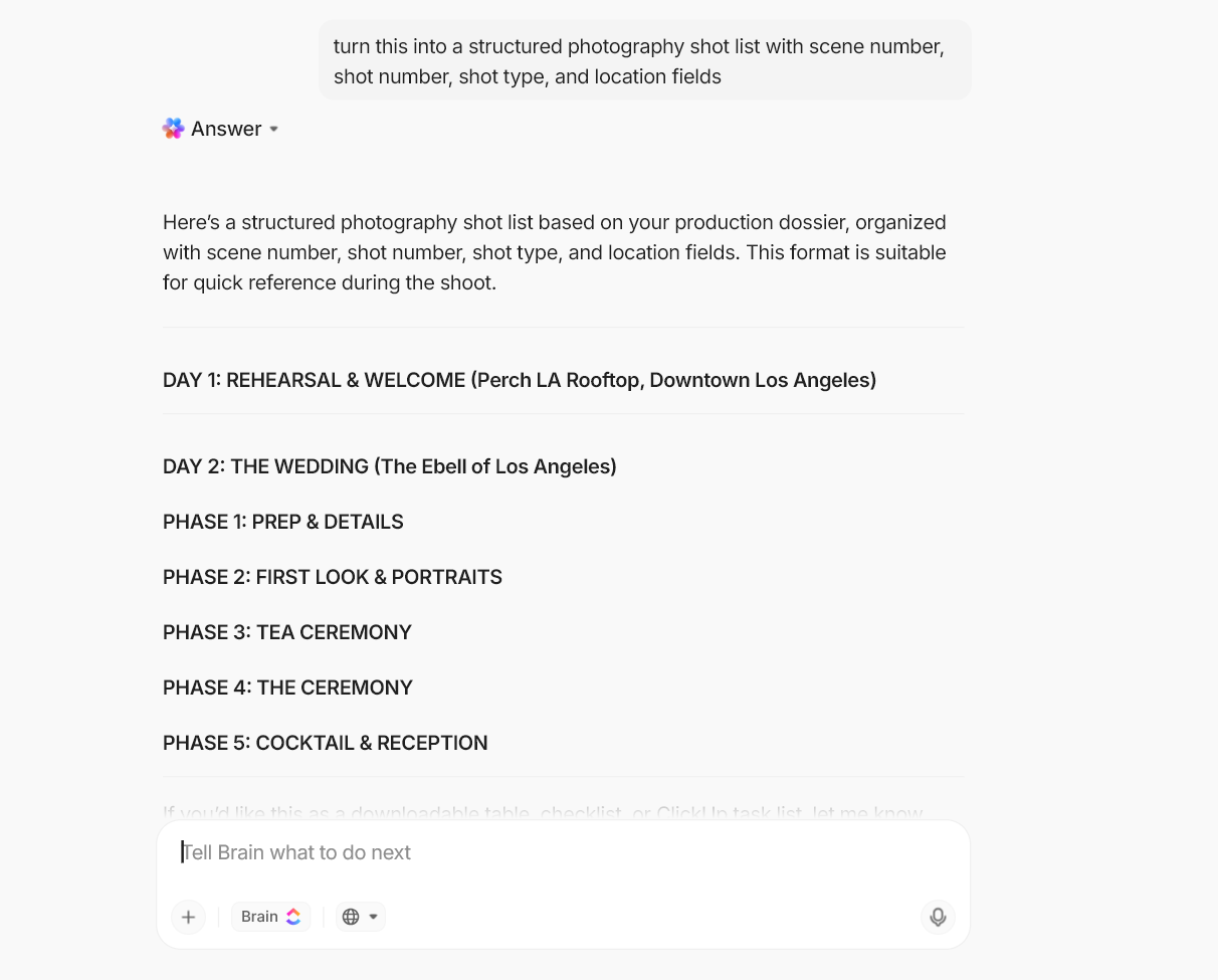 Drop your rough notes, client emails, or moodboard comments into a ClickUp Docs or ClickUp Tasks, then ask ClickUp Brain to “turn this into a structured photography shot list with scene number, shot number, shot type, and location fields.”