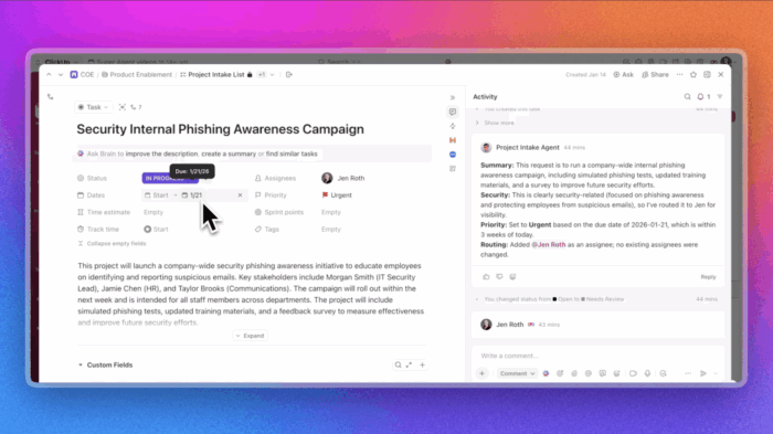 ClickUp Super Agents take this a step further by acting on context, not just rules. Agents can monitor work, identify risks, summarize changes, or suggest next steps based on what is happening across your workspace.