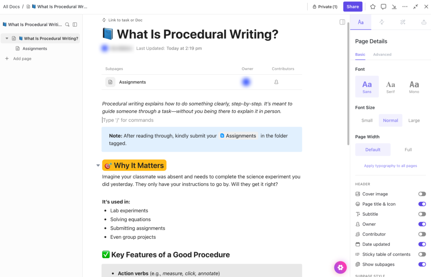 Next, turn the lesson into a dynamic, referenceable learning asset or build a procedural writing unit using ClickUp Docs as your central hub.