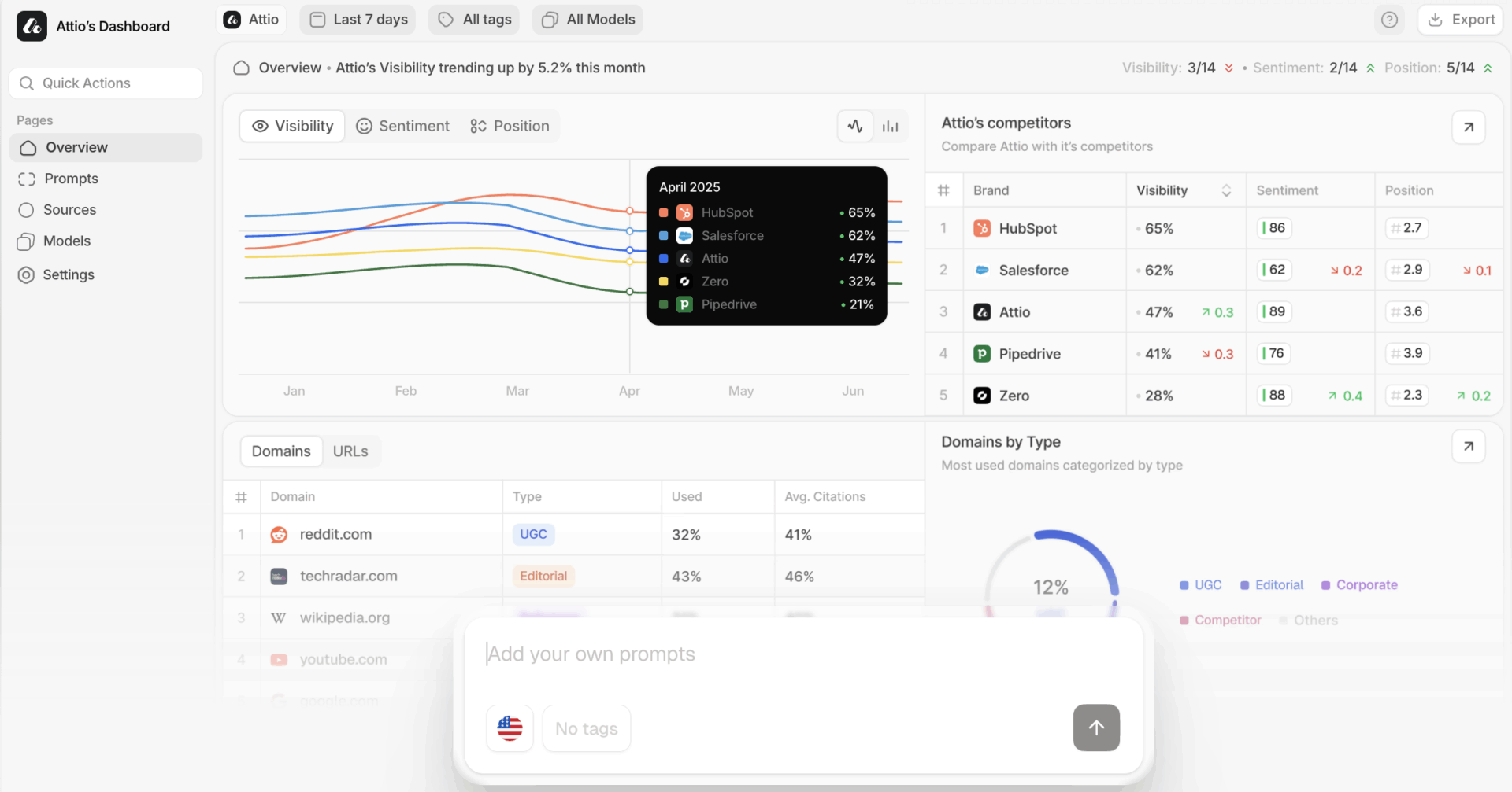 This feature is useful for practical reporting. Set up the prompts that matter to your pipeline. Then review trends in visibility and mentions as results shift.