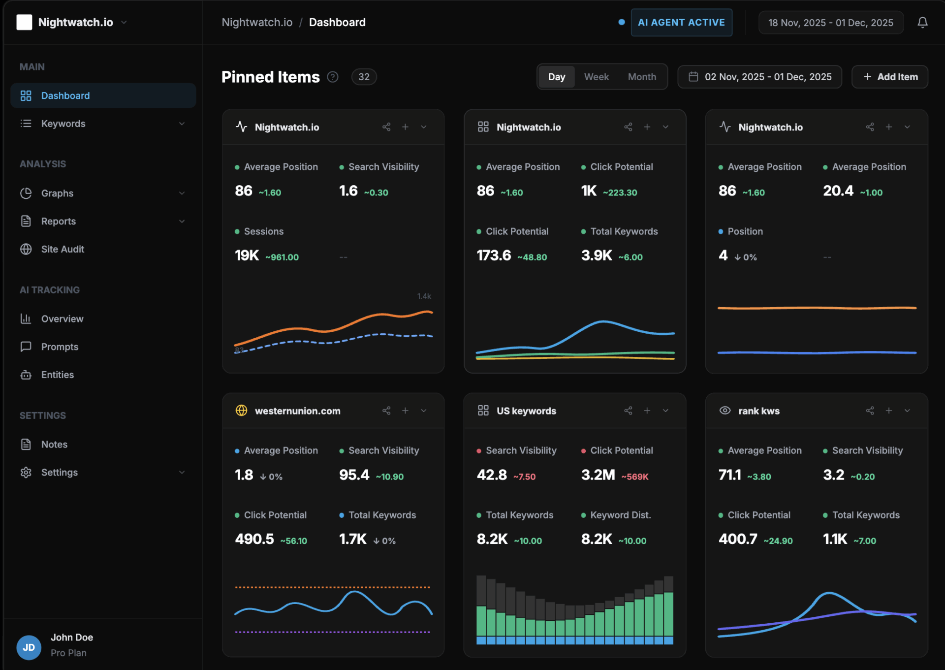 Nightwatch also makes investigation work easier when traffic drops. You can line up “what changed” with supporting context, like keyword movement, SERP volatility, and page-level tracking, then decide whether you need a content refresh, internal linking updates, or a technical fix.