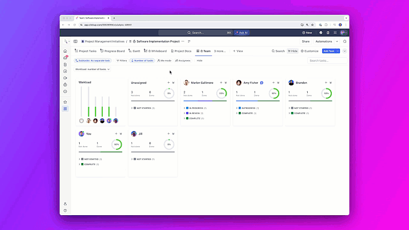 Instead of digging through endless lists, you’ll see a heatmap that instantly highlights who’s maxed out and who still has bandwidth. From there, you can drag and drop tasks to reassign wherever needed.