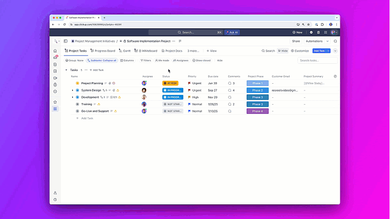 As the world’s first Converged AI Workspace, ClickUp brings every part of project management together—tasks, documents, goals, dashboards, and custom views—into one unified, AI-powered space. Whether you’re planning, assigning, tracking, or shipping, ClickUp handles the entire workflow end-to-end so nothing slips through the cracks.
