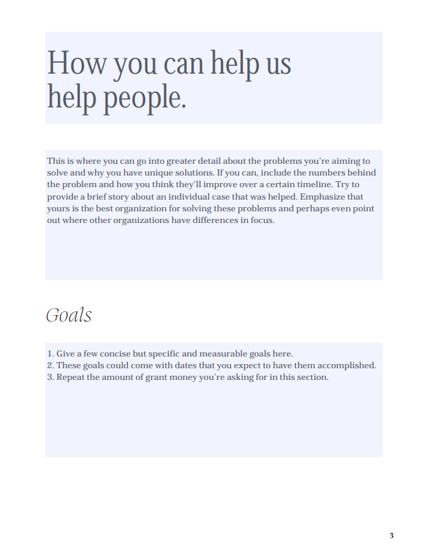 It includes key sections like a cover letter, executive summary, statement of need, objectives, strategy, evaluation and project plan, and budget. This keeps everything structured and cohesive.