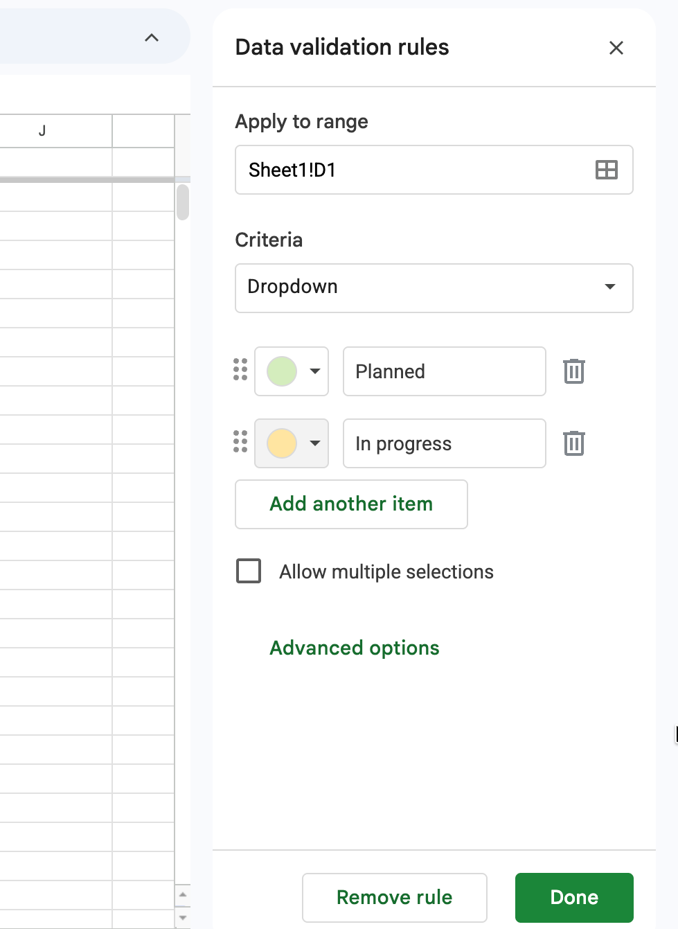To set this up, select the column you want to standardize, e.g., your Status column. Then, navigate to Data > Data validation and choose “Dropdown” from the criteria list. Enter your predefined status values: Planned, In Progress, QA, Deployed, Rolled Back.
