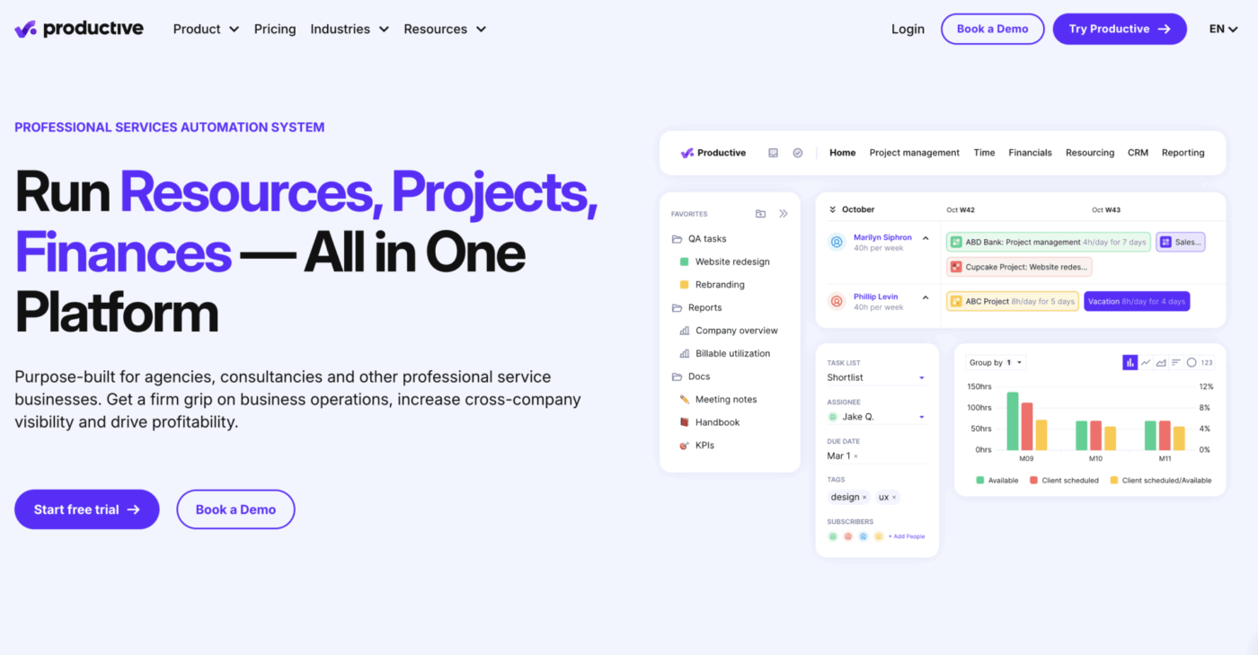 Productive.io is a professional services automation (PSA) platform built specifically for agencies and service-based businesses that need full visibility across projects, resources, and finances.