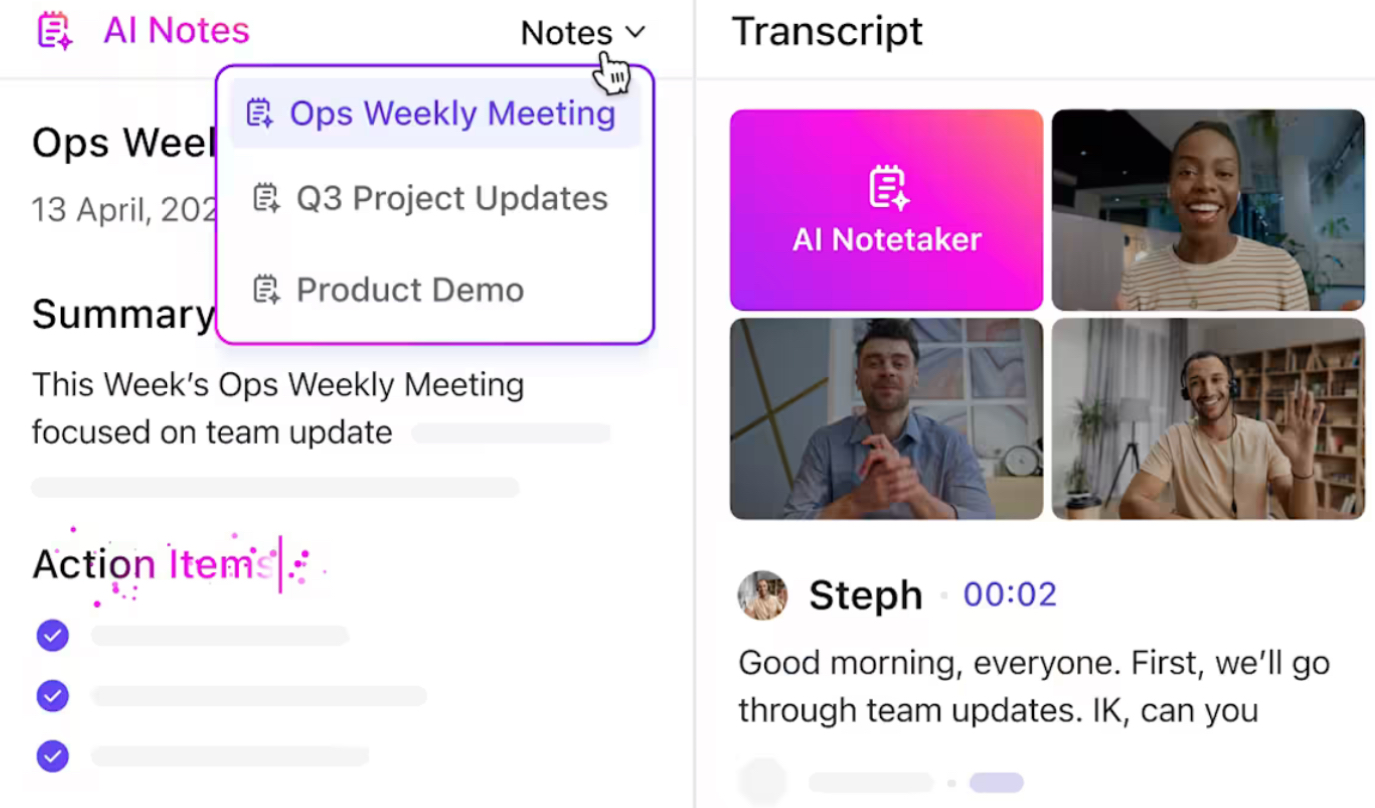 Additionally, ClickUp AI Notetaker records key takeaways from sales meetings and coaching sessions. This AI tool for meeting notes automatically captures discussions, summarizes insights, and highlights action items so that every follow-up is executed.