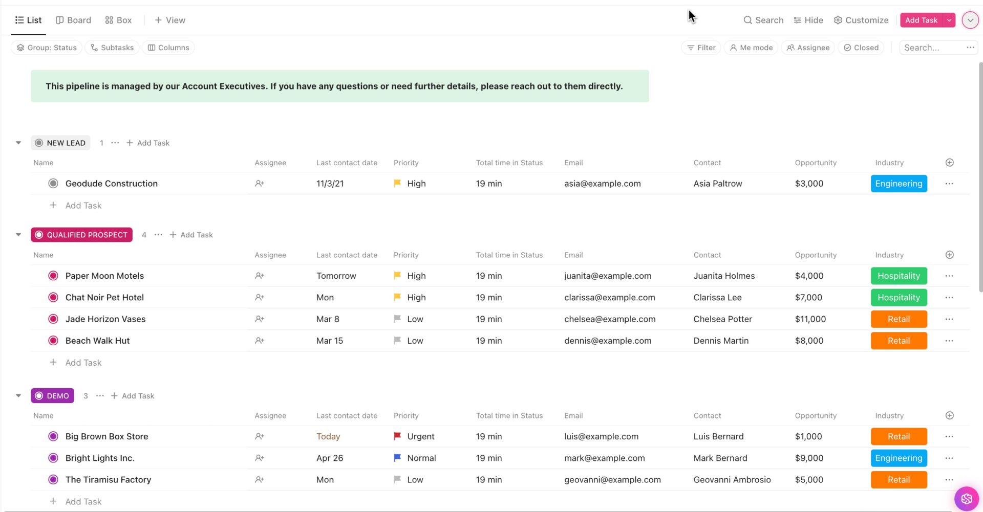 This template includes the ClickUp Board View, which you can use to visualize all the steps, including lead generation, qualification, nurturing, and conversion.