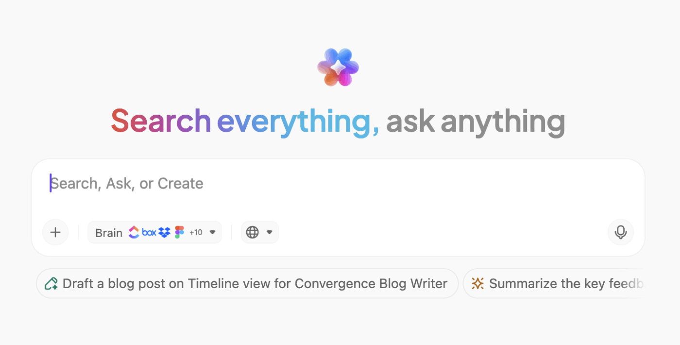Brain MAX eliminates AI sprawl by centralizing all your AI tools and workflows in one place. You can search, create, and take action across ClickUp, your connected work apps (like Figma, GitHub, Google Drive, SharePoint), and the web, all from a single unified interface.