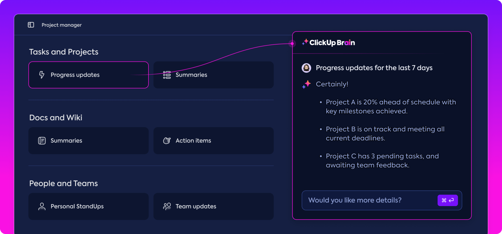 The best thing about ClickUp Brain is that it’s not a separate tool you add to your workflows. It already exists within your ClickUp ecosystem and can browse through docs, tasks, media, projects, and templates to present you with the most relevant information.