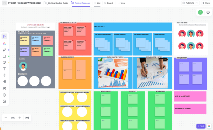ClickUp’s Project Proposal Whiteboard Template takes the pitch process out of spreadsheets and into a visual, collaborative setup.