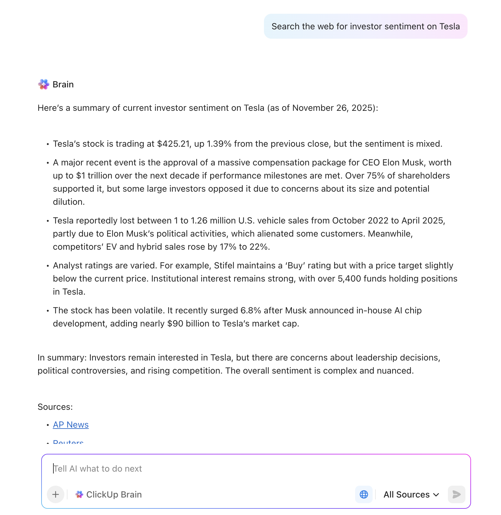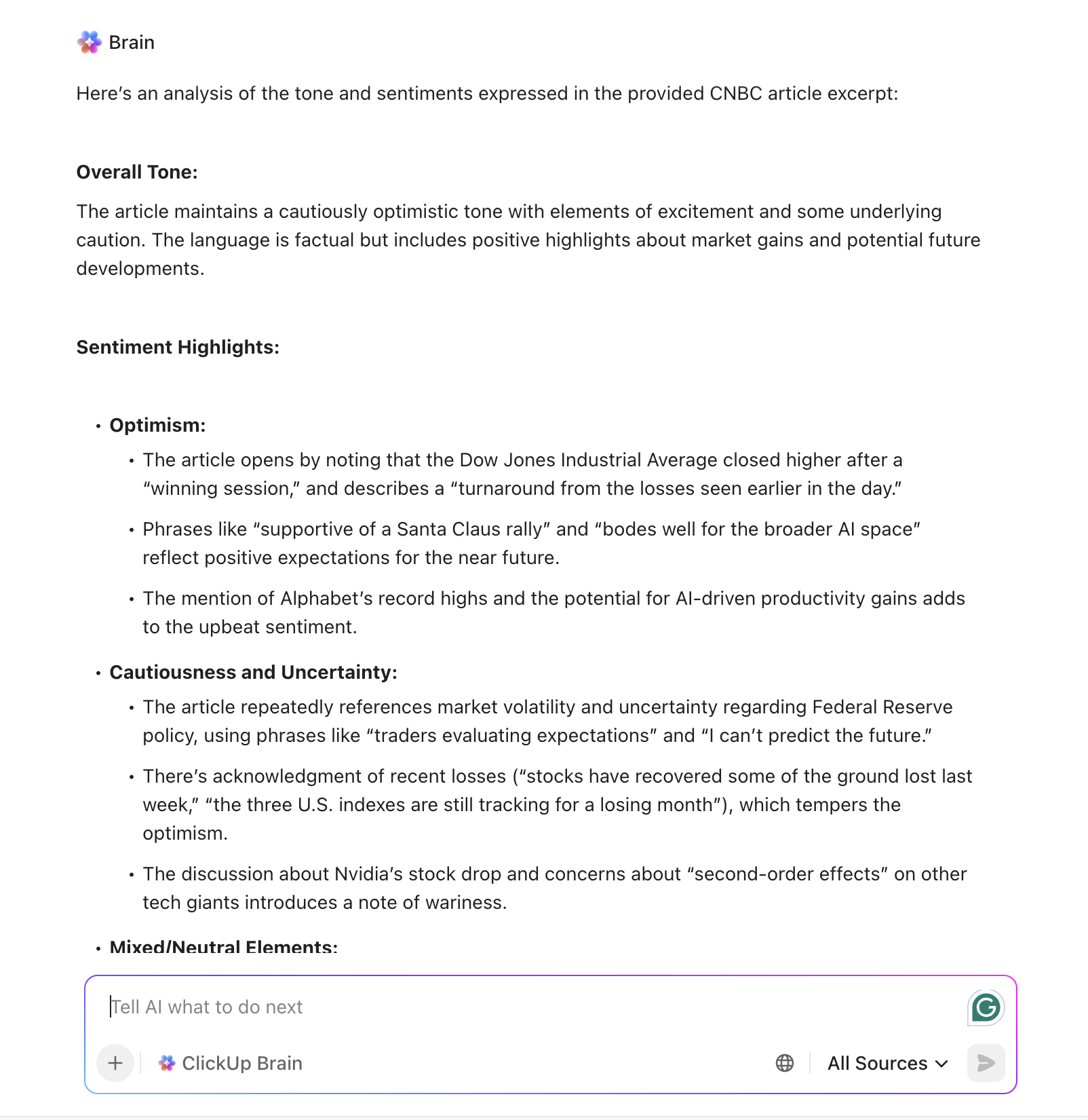 Stock sentiment analysis relies heavily on textual data: news articles, social media posts, earnings notes, and research commentary. ClickUp Brain lets you paste that textual data into a task or Doc and ask questions like: