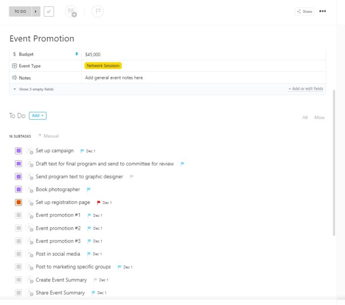 What is the one thing that can change investor sentiment? Events! ClickUpโs Event Promotion Template gives you a structured way to plan and track every promotional task around your next investor-facing event, from social posts and email invites to reminders and recap content.ย