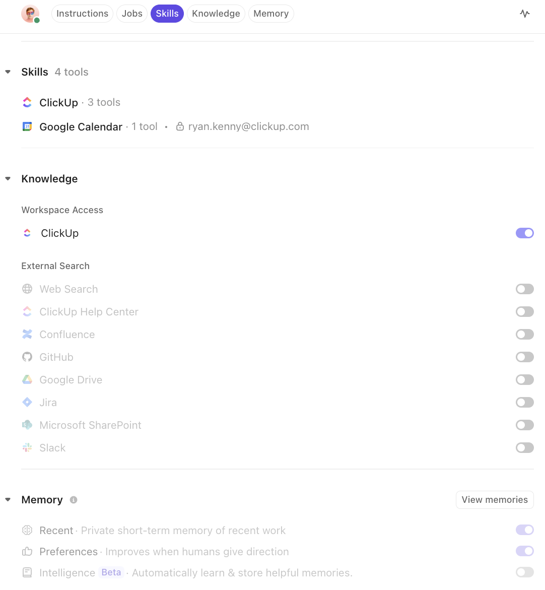 ClickUp will ask follow-up questions to shape the Agent’s behavior, tools, and access. When the setup is done, it’ll show you a full Agent profile.