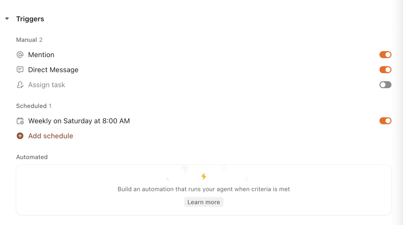 From there, the agent runs like clockwork, collaborating with your team in tasks, Docs, and Chat, and escalating anytime a human needs to weigh in.