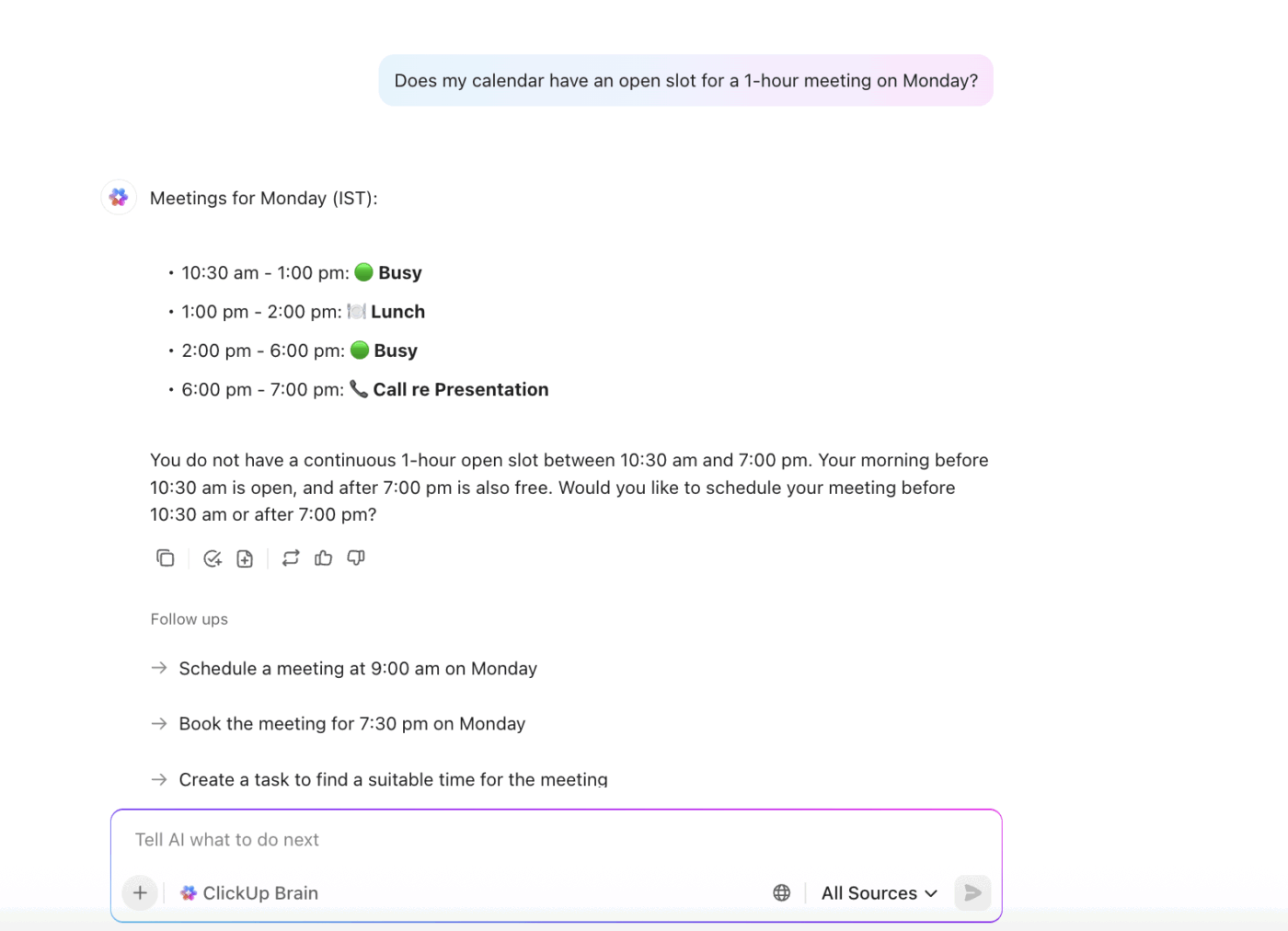 ClickUp Brain, being fully integrated with the Calendar, recommends optimal time slots, automates time-blocking, assigns bookings to team members, and ensures your schedule stays balanced—no more double bookings or missed appointments.