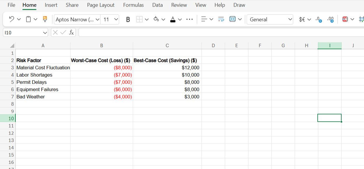 📌 Example: Say you’re managing a construction project. In this case, various factors such as material price changes, labor shortages, permit delays, bad weather, and equipment failures can impact costs. This could be your data: