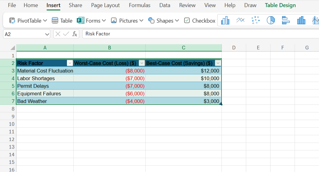 Using the same construction project example, let’s understand by creating a tornado diagram with Microsoft Excel.