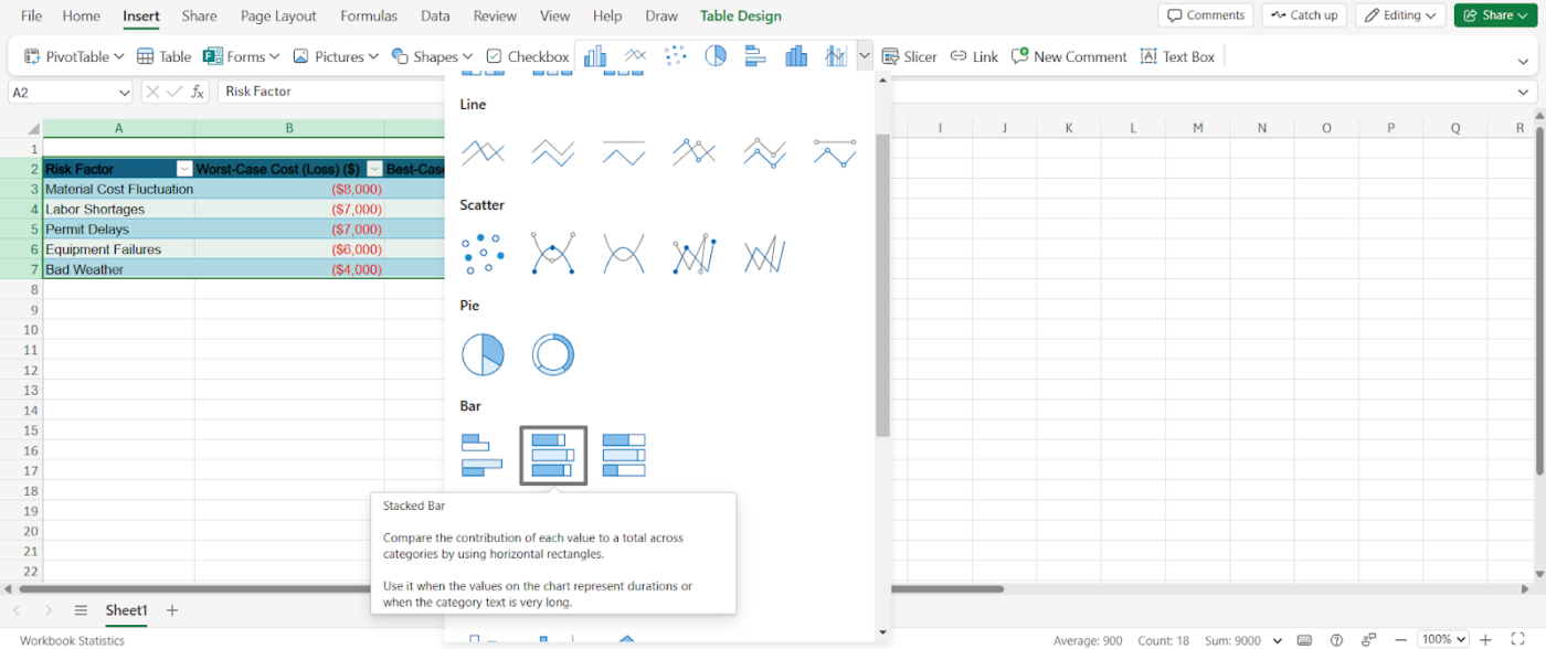 4. Select the entire table and click Insert. In the charts section, select Stacked Bar