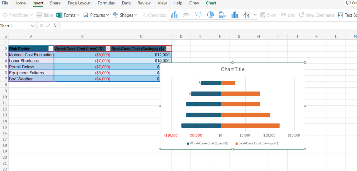 This tornado diagram shows which risks have the biggest impact (negative and positive). The longest bar is material cost fluctuation, which implies that it could cause major financial headaches. Knowing this, you can take preventive actions, like ensuring regular maintenance or having backup equipment ready.