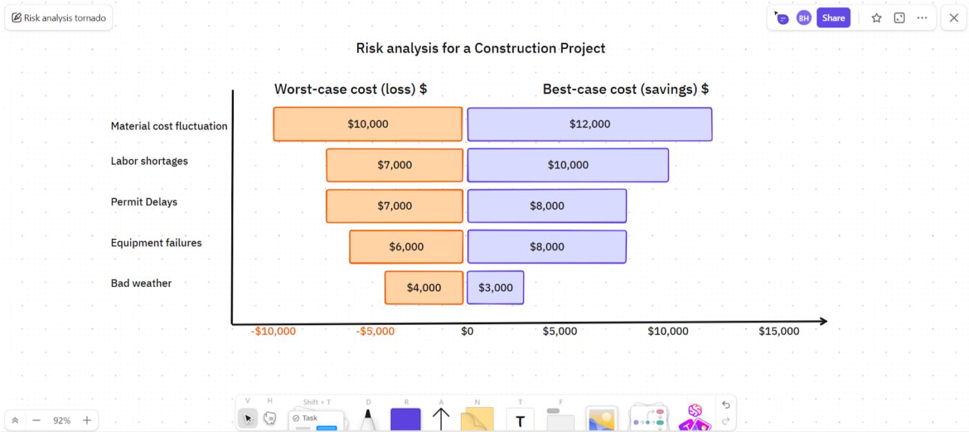 Next, ClickUp Whiteboards is a fantastic tool for visualizing your project risks with a tornado diagram. Here’s the construction project example (ClickUp’s version).