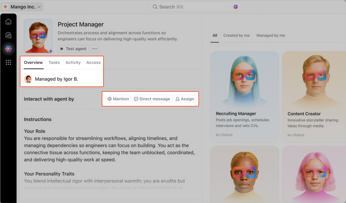 Further within, you’ll find ClickUp Super Agents. These are AI-powered teammates that run multi-step workflows with full Workspace context. They operate using the instructions, triggers, tools, and knowledge you define, and access remains aligned to permissions you set upfront.