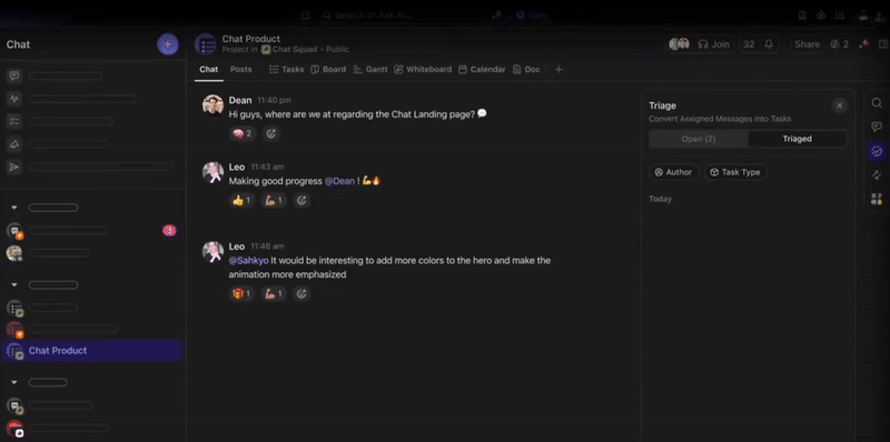 Knowledge and collaboration stay tied to execution. ClickUp Docs connect directly to tasks, so decisions and specs don’t drift. ClickUp Chat keeps discussions attached to work items, and AI Summaries can turn threads and meeting outcomes into actionable follow-ups without losing attribution or intent.