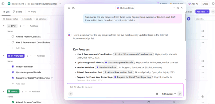 As the world’s first Converged AI Workspace, ClickUp solves this at the system level by embedding AI directly inside the work itself. Instead of generating notes that sit in a silo, ClickUp Brain operates with live context across tasks, docs, chat, goals, and calendars, so outputs become execution-ready by default.