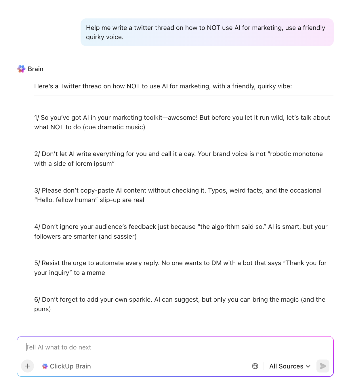 💡 Pro Tip: ClickUp Brain is your AI-powered assistant designed to make planning, structuring, and publishing Twitter threads effortless. Here’s how it can help you: