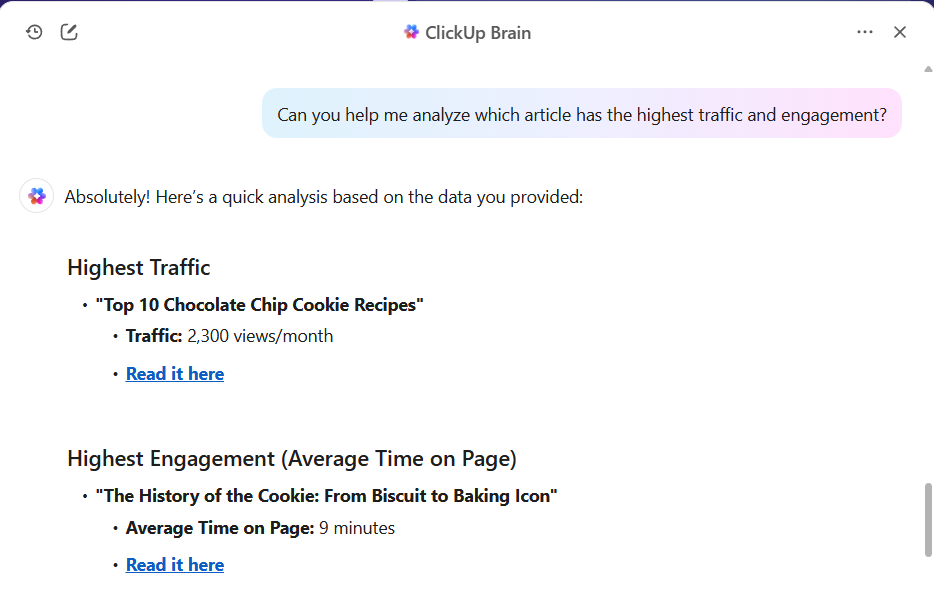 ClickUp Brain can suggest key moments worth highlighting and draft social copy for each segment. Stuck on video titles or thumbnails? Ask Brain to analyze your best-performing content and recommend ways to refurbish it that resonate with your audience. See below how you power your entire content video-led production with ClickUp AI.