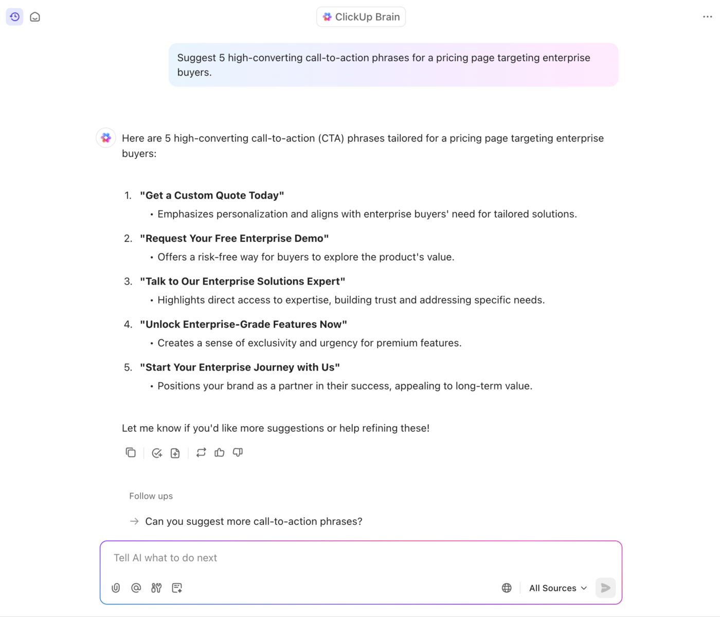 Or you’re working on a bottom-of-funnel landing page and need actionable CTAs. Try: ‘Suggest 5 high-converting call-to-action phrases for a pricing page targeting enterprise buyers.’
