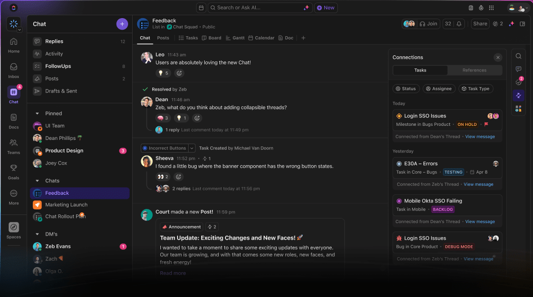 Not only does ClickUp Chat ensure there is no break in your workflow, but it also records and links all relevant comments to their corresponding tasks.