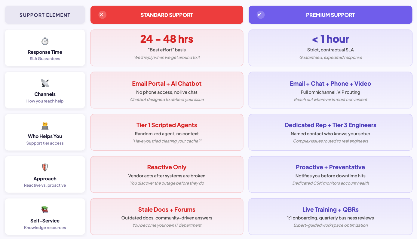 | Proactive support | Reactive troubleshooting where the vendor only acts after your systems are already broken and operations are halted. | Preventative care: The vendor notifies you of known downtime before you notice it, and your dedicated rep actively follows up after a ticket is resolved. |