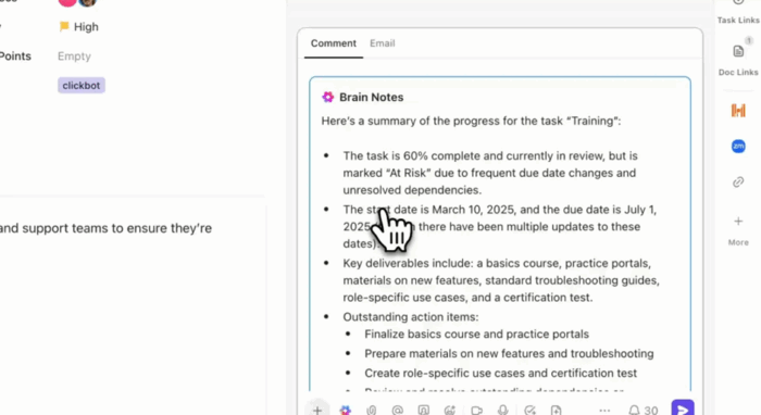 From there, ClickUp Brain can summarize long discussions, suggest owners and due dates, and keep docs and tasks aligned.