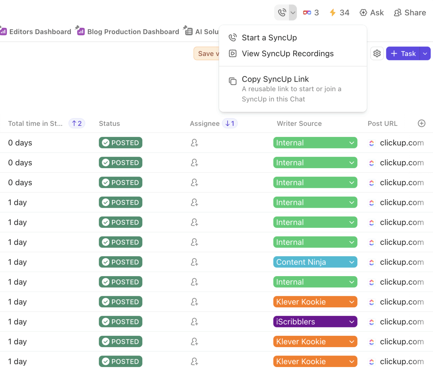 Ano. Zahajte hovor z prostoru kampaně a sdílejte své panely ClickUp, abyste mohli sledovat průběh, klíčové ukazatele výkonnosti a výkonnost týmu v reálném čase. Aktualizujte kartu nebo stav na místě a všichni uvidí změnu na jedné platformě.
