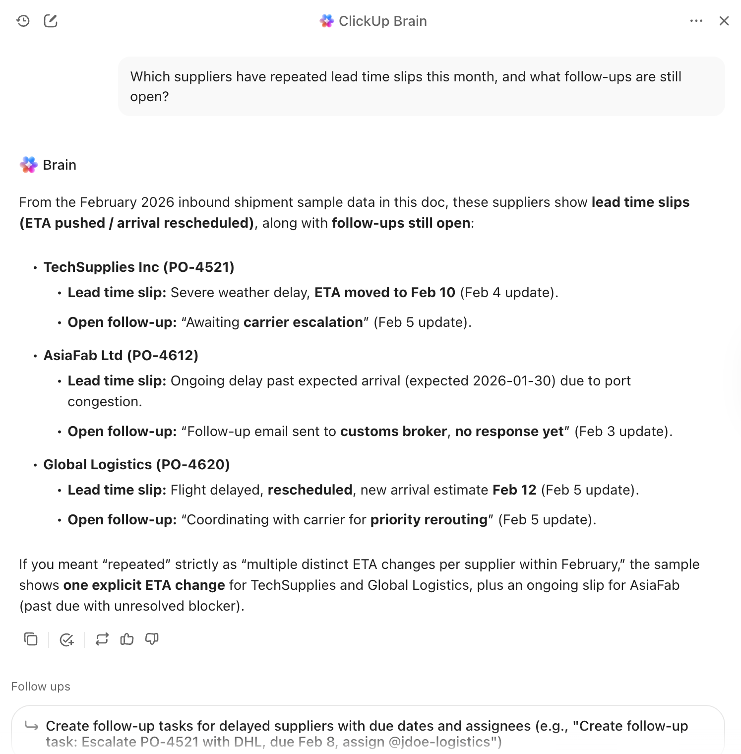 1) Pochopte svůj dodavatelský řetězec s ClickUp Brain