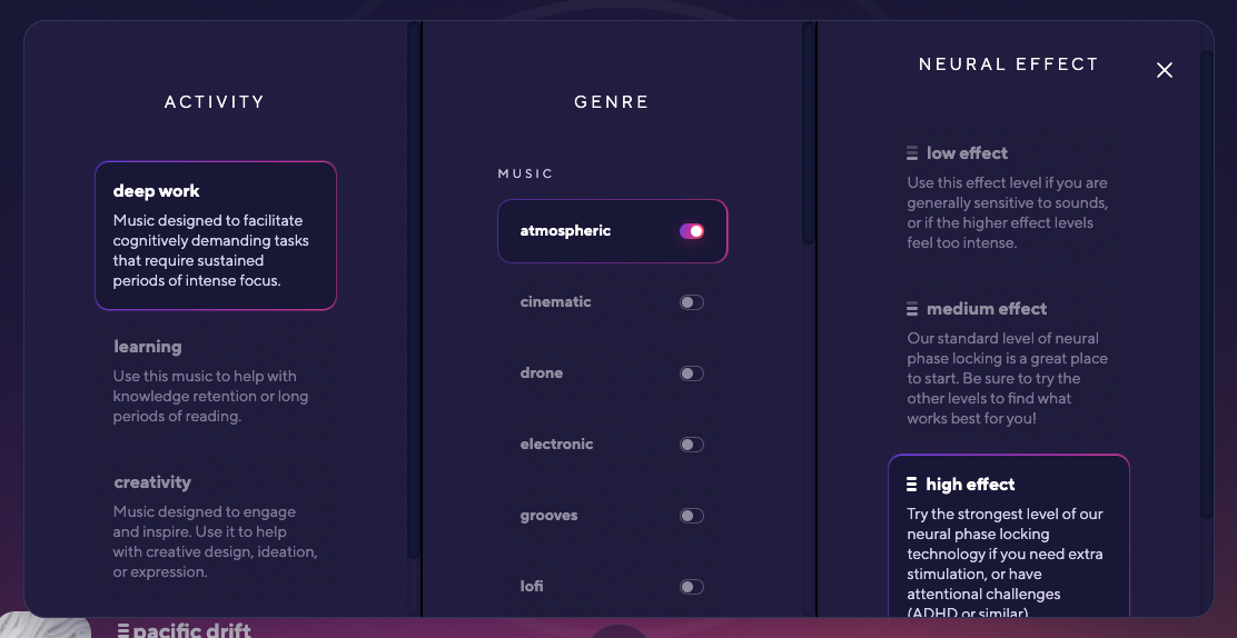 - Wählen Sie Fokusmusik basierend auf Ihrer aktuellen Aktivität und Ihrem gewünschten mentalen Zustand aus