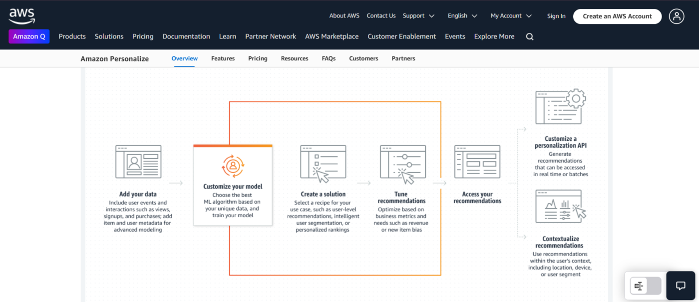 Für Marketingagenturen, die mit E-Commerce, Medien oder ähnlichen Geschäften arbeiten, bietet Amazon Personalize die vorgefertigte KI, die Sie benötigen, sodass Sie sich nicht um die Erstellung komplexer Algorithmen von Grund auf kümmern müssen.