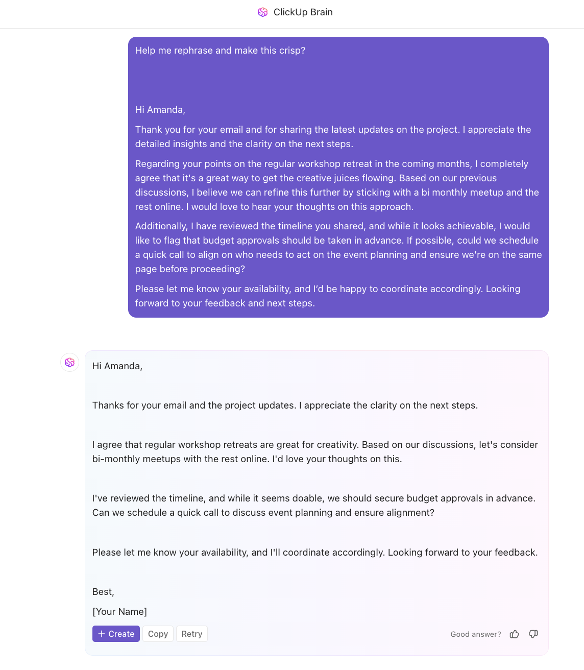 Tanto si necesitas que tu comunicación sea más impactante, refinar su tono o reducir el número de palabras, ClickUp Brain te ayuda a redactar la respuesta perfecta, sin tener que pensar demasiado en cada palabra.